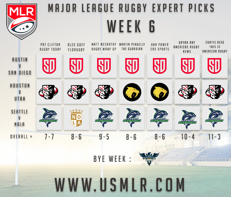 With the Raptors idle for a second straight week, a few teams looking to threaten the top spot have an opportunity to inch closer this weekend. Week 6 kicks of Friday night in Austin as San Diego visit Elite, followed by a Saturday night clash between Houston and Utah, closed out with a NOLA v Seattle match up on Sunday to finish the weekend. Buckle in sports fans, you've got Major League Rugby at every corner this holiday weekend!